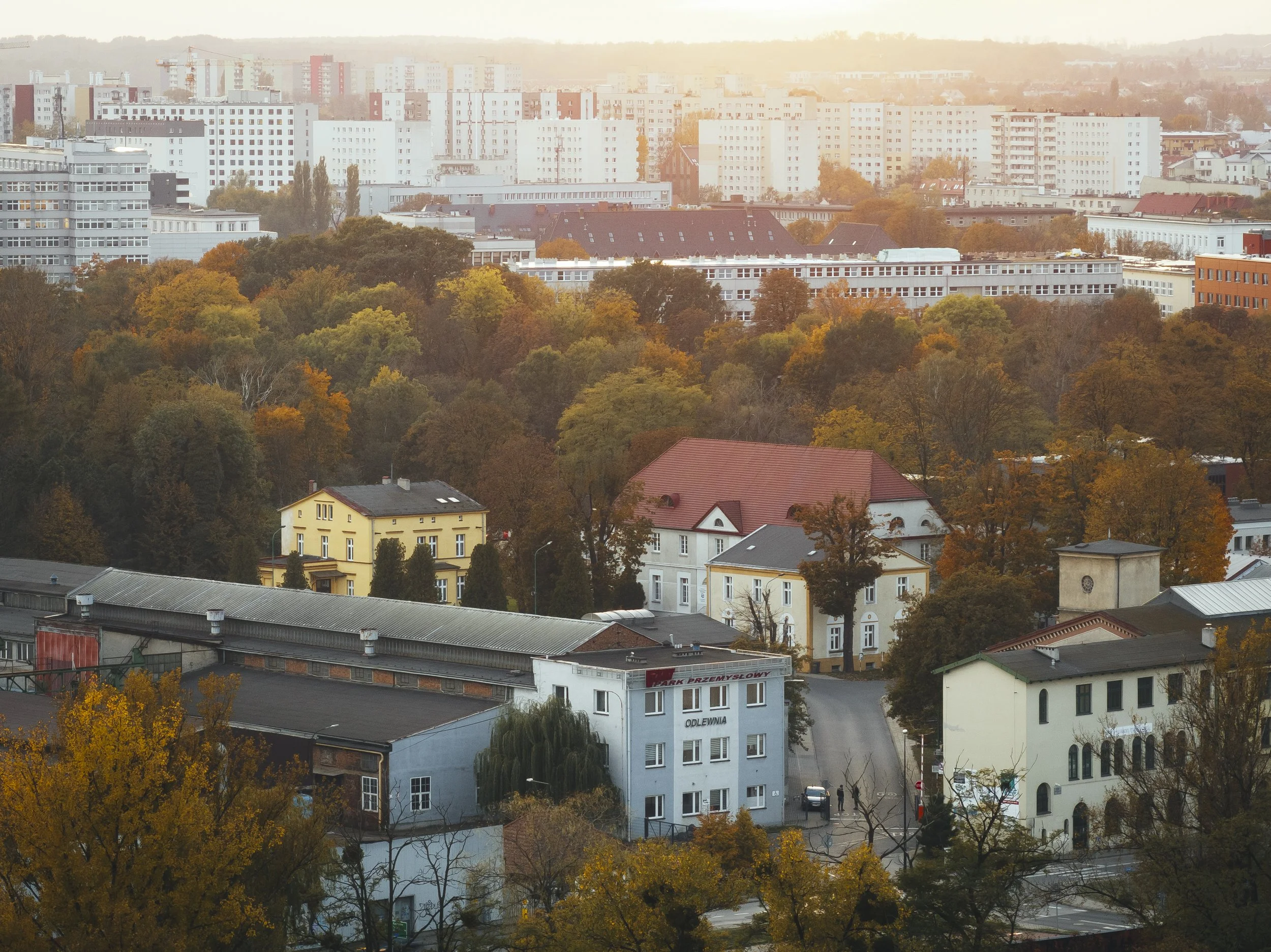 Pod koniec października, w ciepłych barwach zachodzącego słońca, nasz Park Przemysłowy został sfotografowany z niecodziennej perspektywy. Te wyjątkowe ujęcia ukazują nasze historyczne budynki, otoczone jesienną scenerią. Jesienne kolory i cienie długiego dnia podkreśliły industrialny charakter przestrzeni, tworząc niepowtarzalny kontrast między naturą a przemysłową i historyczną architekturą.